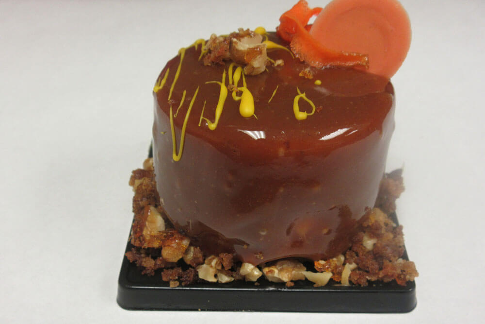 (As seen on Masterchef) Carrot cake, apricot, rice bubble disc, praline cremeux, covered with caramel glaze and garnished with cara-melised walnut crumble. Minimum order of (20)
